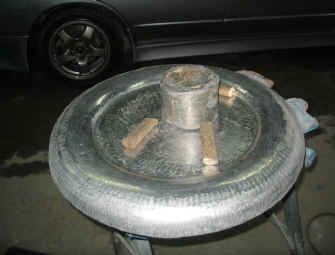 こんな具合となります。 勿論、これで完成ではありません。ここからタイヤカバーとしてきちんと機能する様にロックハンドルなどをつけて行きます。 |