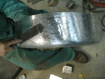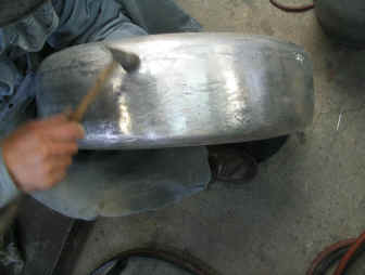 今までの作業はタイヤカバーの内側となる部分ですので、次にコンチネンタルキットの象徴である側面の化粧部分を作成します。 ここも作り方はタイヤカバー内側と同様、ひたすらハンマリングにより形状を作りこんで行きます。 |