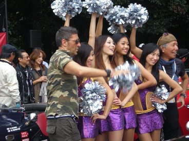初参加のクレイジーケンバンド横山剣氏と一緒に写真を撮って頂きました。 パンッツェッタ・ジローラモ氏は、「恥ずかしい」と言いながら、チアガールと一緒に応援されていました。 |