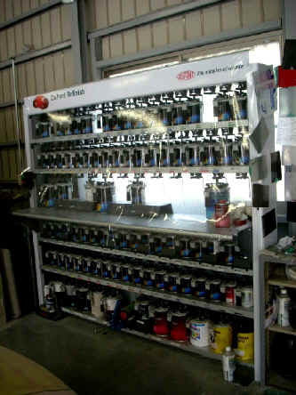 左画像がデュポン社のセンタリです。 常に安定した品質を維持する為に、上2段に塗料をセットすると自動的に攪拌してくれます。 |