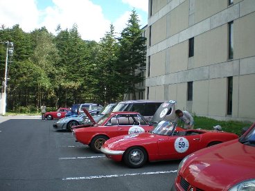 昼食会場のアンビエント蓼科に到着です。会場に並ぶ珍しい車両達。 カウルを開けているのはアルファロメオTZ1。CDLMプロトも並んでいます。 ここではおいしいカレーを頂きました。 |