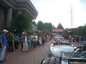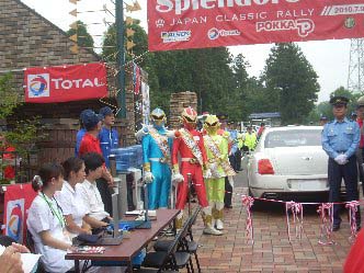 スタートは博物館です。 沢山の車両が集まってきました。 スタート前では地元のヒーローのお出迎えと警察署長のご挨拶がありました。 岡本夏生さんもゲストでごあいさつです。年齢を感じさせない美しさでした。 |