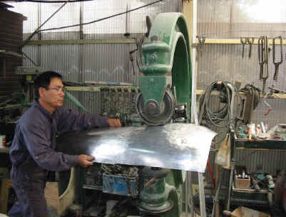 番線と現状のボディ面を参考に、叩いては均しを繰り返してアルミ板材を縮め、成型して行きます。