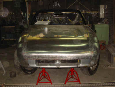 左右のフェンダー部の成型が終りましたので、フロントマスク部分を成型しましょう。 下の写真では、左右のフェンダーとのつなぎ目部分の成型を終えたところです。 やっと形が見えてきました。 |