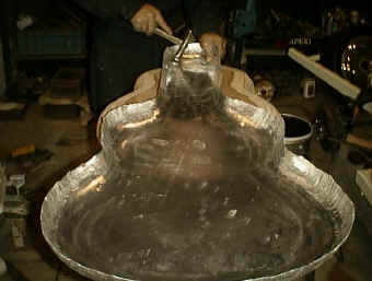 ひとまず上下二枚同じ物を製作いたします。 一枚が蓋、もう一枚が底になります。 左は端を絞ってフランジ形状にしているところです。 |