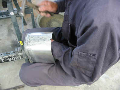 1)前回下半分を製作いたしましたので、今回は上半分を製作しました。 左記写真は溶接部分の均しをしているのですが、溶接部分の盛り上がり(ビード)は削って均すのではなく、叩いて均しております。 それを行うことにより、溶接時に焼きなまされた部分を鍛造により強度を回復させる効果もあるためです。 |