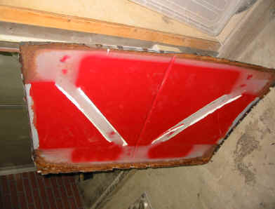今回、インナパネルは再利用可能でしたので、上記で作ったアウタパネルに既存のインナパネルを組み合わせます。 勿論、全てを新たに製作することも可能ですが、再利用できる部品を利用することにより、少しでもオリジナル部分を残すことも出来ますし、出費も抑えることも出来ます。 下の写真はサーフェイサー塗装後、拾いパテで最終仕上げを行ったところです。 ご覧いただけると分かりますが、ほとんど拾いパテは残っておりませんので、きちんと形状を出すことが出来ました。 |