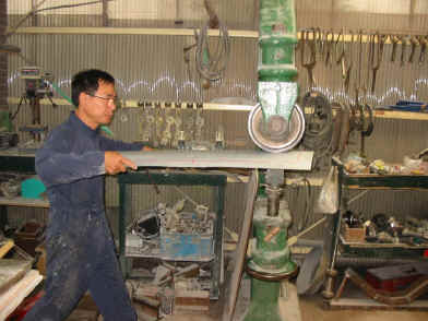 では、製作に入りましょう! 一枚の鋼板をハンマリングして製作する方法もありますが、当社にはイングリッシュローラーがありますので、それを使用します。 度々登場するイングリッシュローラーですが、これが結構むずかしいです。 上記写真の様に自分から見て押し込む方向に押す場合は問題ないのですが、自分の方向へ戻す場合、ローラの動きが逆になり、板金物があらぬ方向に走ってしまいます(笑) 実際遣って頂けたら非常にわかりやすいのですが、例えると、ラジコンを後ろから見て操作する場合と、正面から自分の方向へ向って行く際、操作方法が逆になると言えばお分かり頂けるかな?と思います。 とは言っても、慣れてしまえば、全く問題ありません。 そうこう言っている間に出来上がりました。 |