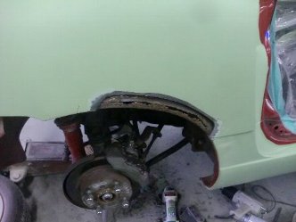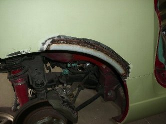 右リアフェンダータイヤハウス部表面の腐食が進んでおり、インナーまで侵食されておりました。 右下画像が切り継ぎ修理前、左下画像が修理後となりますが、こんな感じで修理して行きます。 |