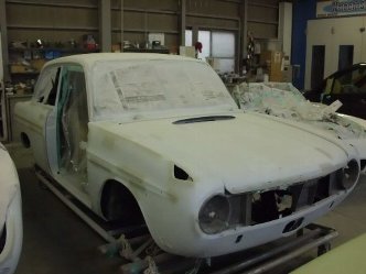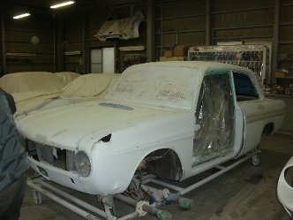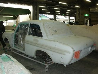 今回はボディの鈑金作業が中心です。 ボディは付属部品分解後、旧塗装膜を研ぎながら凹みや一部錆を修理します。 前後ガラスはゴムの入手が困難の為、取り外さずにマスキングにて対処します。 この車は、一部現代の車両と違う変わったボディ構造にて組み立てられておりますので、次回ご紹介致します。 |