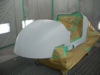 まずは下地です。 今回は形状を美しく見せる為多少の凹みや歪等をパテで成形を行いました。 (戦前の車両なので凸凹の大きな車両も多いのですが・・・。) その後サフェーサーを入れてペイントを行いました。 (画像は塗装ブース内での様子です。)