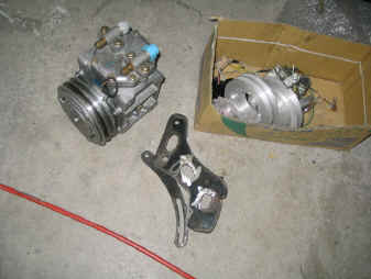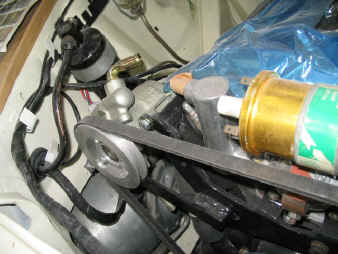 レストアと同時にパワーステアリングを取り付けますので、パワーステアリングポンプブラケットとプーリーを製作しましょう。 ブラケットは鋼材、プーリーはアルミで製作しました。 下の画像は仮止めにてチェック中です。 これで、重いステアリングから解放されますね。 |