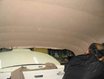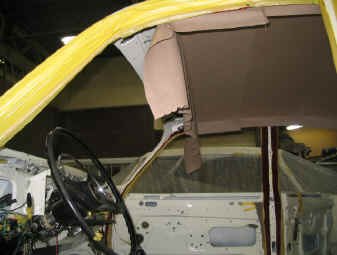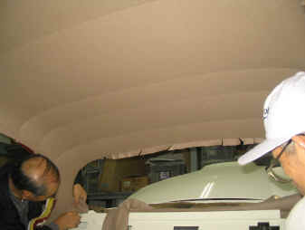下の画像をご覧頂くと、おわかり頂けると思いますが、天井部位は立体的に張り込みますので、幾つかの部分に裁断したものを天井形状に合う様に縫い合わせて行きます。 この際重要なことは、