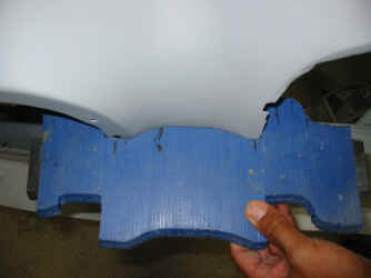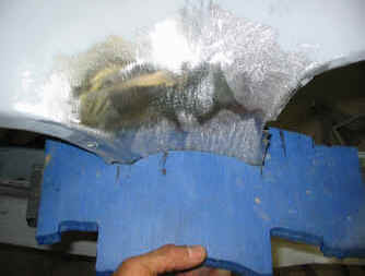 写真の通り、スムーズな形状になっておりません。 この様に複雑な形状部分を板金で修正を行うと他の部分まで影響しますので、半田盛りで直します。 |