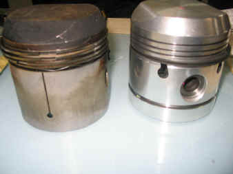 先ずはピストン。 右が新しいピストン、左が古いピストンなのですが、古いピストンにはスカート部にスリットが入っていると思います。