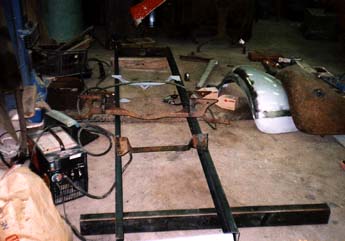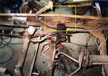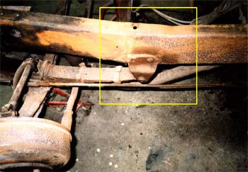 足回りを外して行くと、いたる所に長い年月の負傷の後が出てきました。 フロントアクスル部がへの字に曲がっております。 溶接による修復を行ったようですが、完全に治っておりません。 |