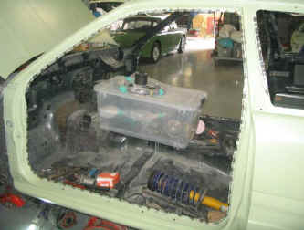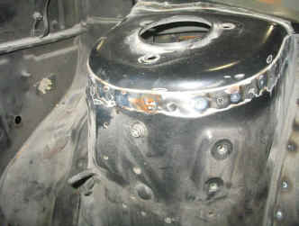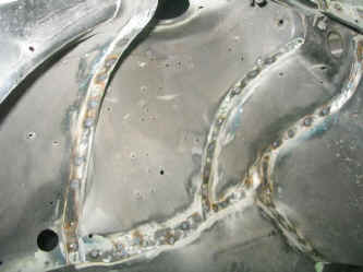 上記塗装除去作業が終りましたら、スポットを打って行きます。 スポット間隔は純正の2倍。つまり、純正スポットの間を打つ感じです。 昔は、ボディもサスペンションの一部であり、適度にシナることが必要との考え方もありましたが、現在はキチンとサスペンションが機能する様、十分なボディー剛性を持たせるべきとの考えが主流ですね。 但し、このスポット増し作業、一部のみに施工するとスポット増しを実施していない箇所に悪影響を与えることもありますので、注意が必要です。 打ち終りましたら錆びない様にコートして完了です。 |