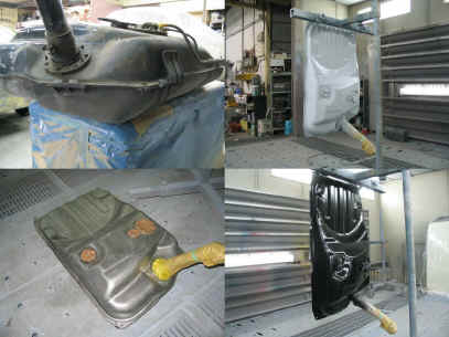 ご覧の通り燃料タンクですが、きちんと乗り続けられる様、防錆も含めて塗装を行います。 勿論、タンクに装着してある部品の状態やメーカー欠品などを吟味しながら、分解して行きます。 使用できる部品はムリに外さず、費用を抑えることもレストアには必要です。 その後、表面の塗装や錆を落とし、サフェーサー→上塗りを行い、完成です。 ピカピカで新品の様ですね。 |