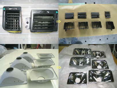 特にエアコンのレジスタ(吹き出し口)は欠品が多い部品ですので、綺麗に再塗装を行います。 レストアはボディーの様に華やか?な部分もありますが、この様に地道な作業がほとんどです。 |